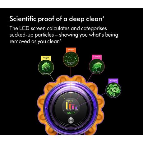 The LCD screen shows what’s been sucked up, displaying real-time scientific proof of a deep clean.