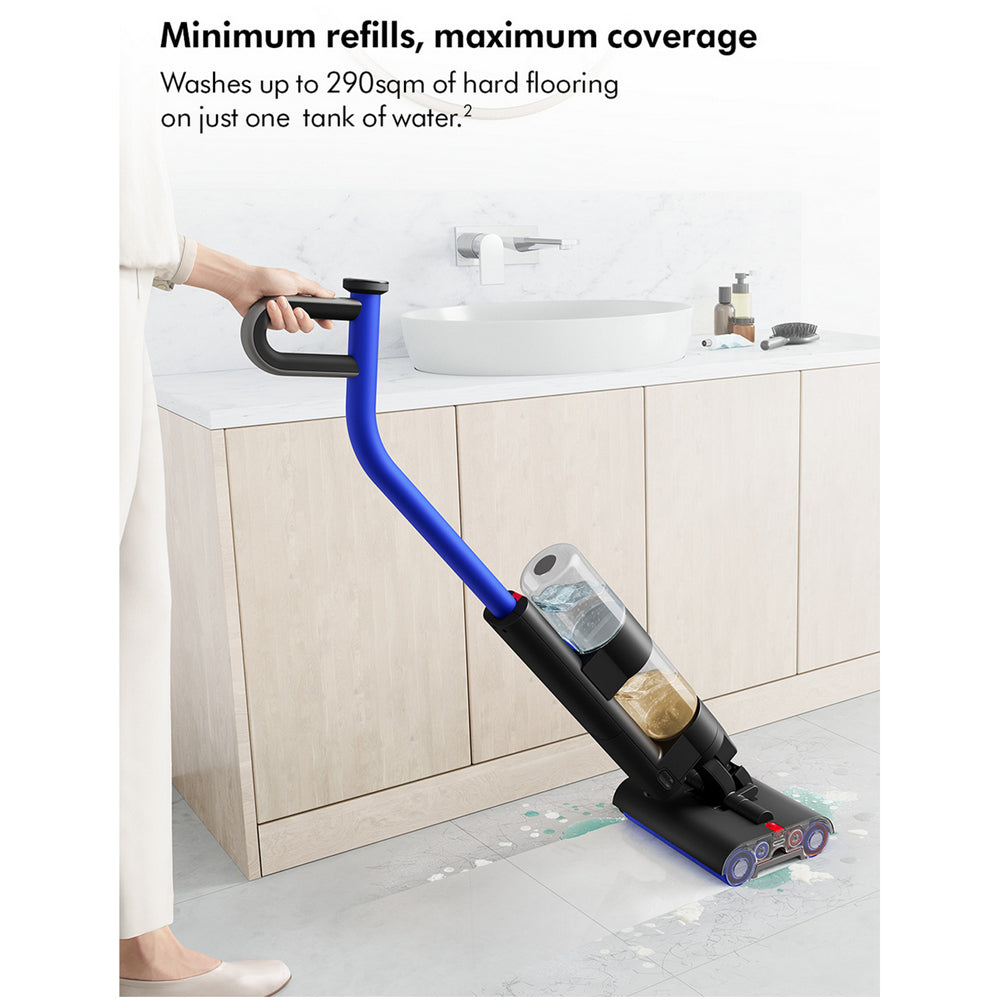 The Dyson WashG1™ wet floor cleaner is designed to give your hard floors the deep clean they deserve. This innovative cleaner removes wet and dry dirt in a single pass, using clean water throughout the entire cleaning process. Whether it's spills, debris, pet hair, or stubborn dried-on stains, the Dyson WashG1™ tackles them all with ease, making it ideal for all types of hard floors.